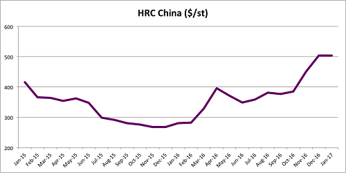 Chinese Hot-rolled coil price climbs. Source: MetalMiner IndX.