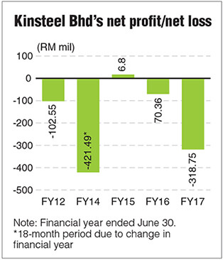 Kinsteel Bhd posted a record net loss for the financial year ended June 30, 2017 (FY17) as it sank deeper in the red in the final quarter of the year, no thanks to a huge RM170.9 million impairment on its convertible securities and receivables in loss-making subsidiary Perwaja Holdings Bhd.