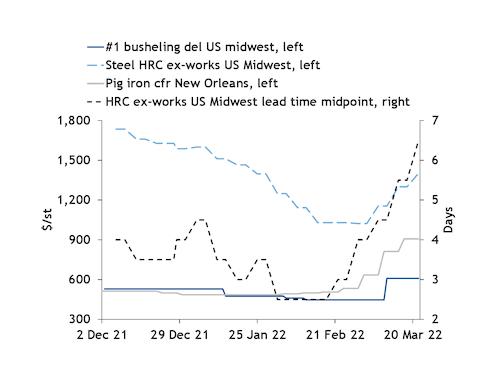 Pressure has grown in recent weeks on global raw material supply chains as pig iron supply has been cut off from Ukraine and Russia. The supply crunch has led imported pig iron prices cfr New Orleans to jump by 70pc since the beginning of March to $907/st ($1,000/metric tonne) on 17 March. Prices were reported as high as $1,089/st ($1,200/t) for rail deliveries from Canada into the upper Midwest US.