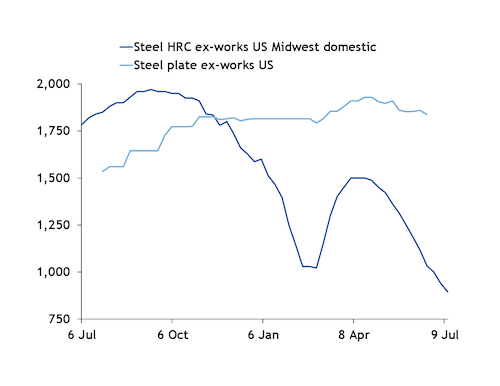 The plate market, which is much smaller than the HRC market with only three main producers, has been held higher by mills that have refused to drop prices by more than small amounts.