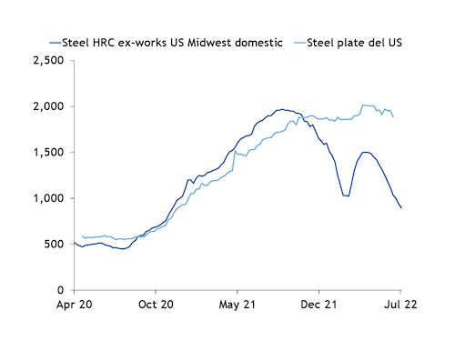 Nucor, one of the largest plate producers which also publishes its prices generally on a monthly basis, lowered their ex-works plate prices by $50/st on 19 May to $1,860/st, and has since kept its prices flat. Freight costs have also remained highly volatile and elevated given increased fuel costs and difficulty securing railcars.