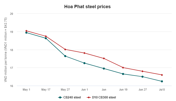 Biggest steelmaker Hoa Phat Group brought its prices of rolled steel and rebar steel down for the eighth time last weekend, bring prices down by VND2.4 million ($102.61) since mid-May.