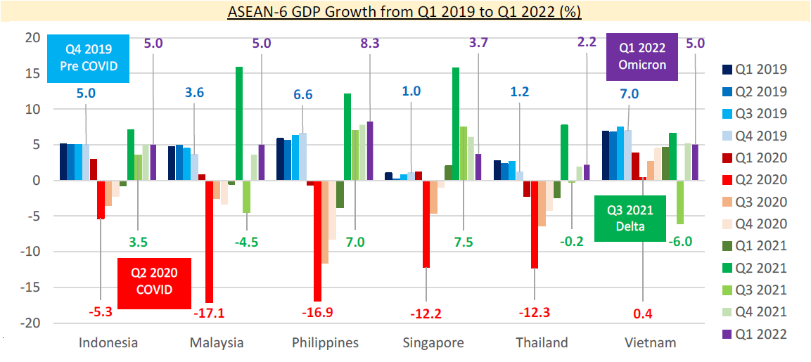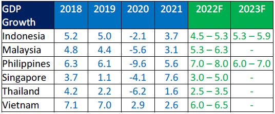 Malaysia, Thailand and Vietnam imposed restrictions during Q3 of 2021 and their economies were affected during that quarter. As such, they only registered 2 consecutive quarters of growth. Indonesia and Philippines registered 4 consecutive quarters of economic, while it was 5 quarters for Singapore.