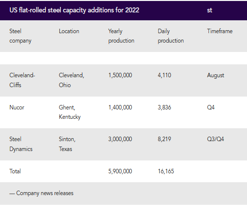 Instead, the steelmakers signaled in their latest earnings reports that they are betting that demand will remain steady or increase, as they pointed to persistent backlogs. The companies will be ramping up at flat-rolled mills that had been running at sub-optimal levels and restartingother mills that had been down for maintenance, bringing on additional supply of an estimated 16,200 short tons/day, or an additional 1.45mn st/quarter, according to production rates listed by the companies.
