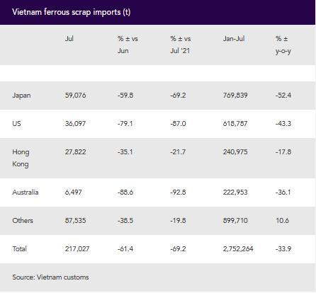 Imports of ferrous scrap in July fell by 61.4pc from the previous month and 69.2pc against a year earlier to 217,000t. This took January-July imports down by 33.9pc from the previous year to 2.75mn t, Vietnamese customs data showed.