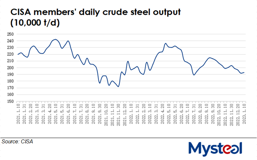 In contrast, CISA estimated China's national daily crude steel output averaged 2.41 million t/d over January 1-10, inching down by 0.01% from late December.