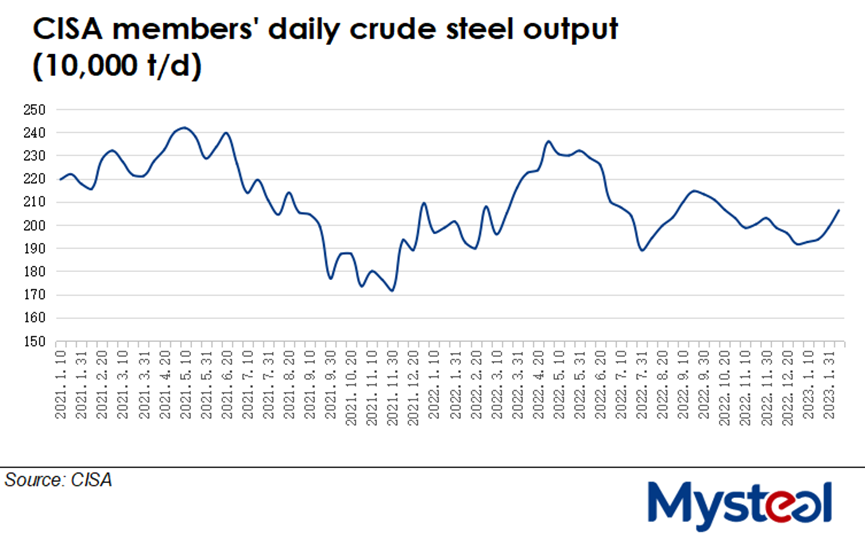 Daily crude steel output among the member mills of the China Iron & Steel Association (CISA) during the first 10 days of February continued the rise that began in early January to hit the highest average since late October last year, according to the association's latest data released on Wednesday.