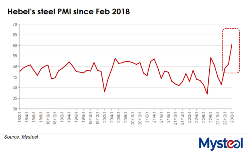 Last month, the sub-index for new orders among Hebei's steel mills soared by 19 points on month to reach 69, thanks to the steel demand recovery and active steel trading following the Chinese New Year holiday that ended on January 27.