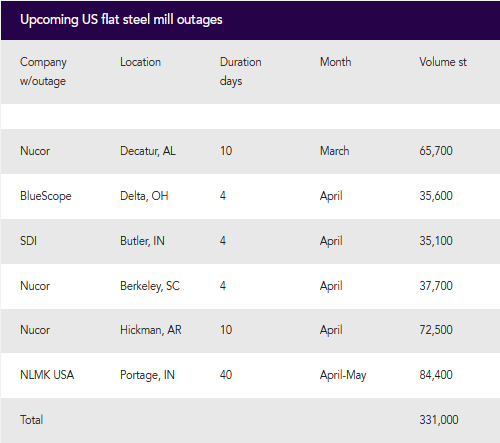 An estimated 331,000 short tons (st) of steel production will come off from March through May across outages at US flat steel mills run by BlueScope, NLMK USA, Nucor, and Steel Dynamics (SDI).