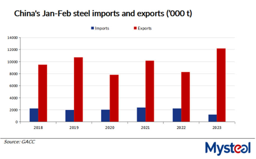 Although China's January-February steel export total showed an impressive year-on-year increase, this was mainly due to the low base in 2022 when the country exported just 8.23 million tonnes of finished steel, a Beijing-based market source commented.