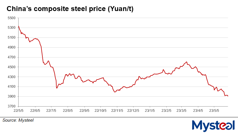 After sliding steadily during the previous two months, China's composite steel price under Mysteel's assessment as of May 31 had lost Yuan 224.4/tonne ($31.6/t) or 5.4% from April 28 to settle at Yuan 3,903/t – a new low since July 8 202.