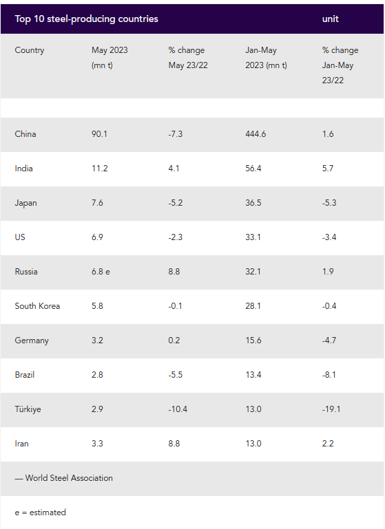 Of the top 10 steel-producing countries, Turkey saw the largest drop in percentage terms, with its output declining by 10pc to 2.9mn t in May. Turkish producers struggled with low demand brought on by uncertainty and pessimism regarding Turkey's macroeconomic situation, especially in advance of the May elections. Mills also found themselves under pressure from aggressively-priced Chinese imports, which led them to reduce capacity utilisation.