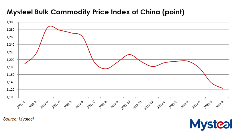 The Mysteel Bulk Commodity Price Index of China (MyBCIC) slid further during June, down by 1.4% on month or 10.9% on year to reach 1,122.8, according to Mysteel's latest report. Nevertheless, though the index has been losing ground since April, the pace of the decline in June had narrowed from May, Mysteel Global noted.