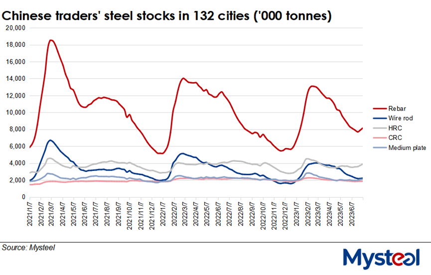 The stocks of rebar, wire rod, hot-rolled coil (HRC), cold-rolled coil and medium plate among traders in the 132 Chinese cities Mysteel canvasses rose by 2.9% or 508,200 tonnes on week to 18.2 million tonnes as of Thursday, a one-month high, the survey results showed.