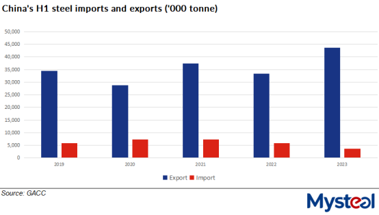 China's total steel exports increased by 31.3% on-year to reach 43.58 million tonnes during the first half of 2023, according to the latest data released by China's General Administration of Customs (GACC) on July 13.
