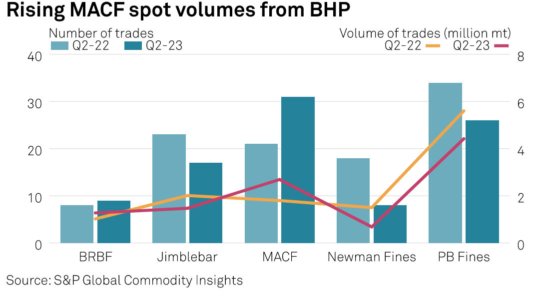 There were 21 spot transactions for lump cargoes by BHP and Rio Tinto in Q2, up 11% quarter on quarter, S&P Global data showed. Among these cargoes, BHP sold 17 cargoes of Newman Blend Lump, up 31% from Q1 2023.