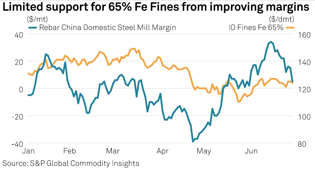 Platts assessed 62% Fe IODEX at $97.35/dmt CFR North China May 24, a six-month low, before prices recovered to $111.6/dmt CFR China June 30, still down 12% from the end of Q1, S&P Global data showed. The assessment for the index stood at $107.6/dmt July 11, and mills are now unlikely to increase their demand for iron ore further in Q3 unless they see clearer signs of steel demand returning to levels that can support healthy production margins.