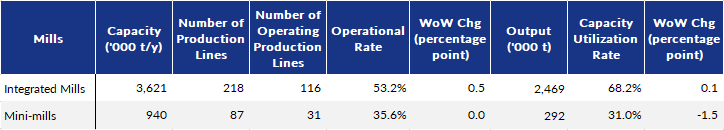 During the survey week, the average capacity utilization rate and operational rate of the bar mills installed at the surveyed producers showed some disparity, with the former reversing down from three weeks of gains, lower by 0.2 percentage point on week to 60.5%, while the latter rose for the second week, up 0.3 percentage point on week to 48.2%, Mysteel's data showed.