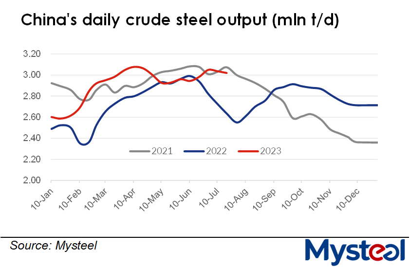 Daily crude steel output in China continued declining over the middle ten days of July, with the tonnage falling by another 16,300 tonnes/day or 0.5% from the prior ten days to average 3.02 million t/d, according to Mysteel's estimate based on survey responses from the 247 blast-furnace (BF) and 87 electric-arc-furnace (EAF) steel mills it monitors nationwide.