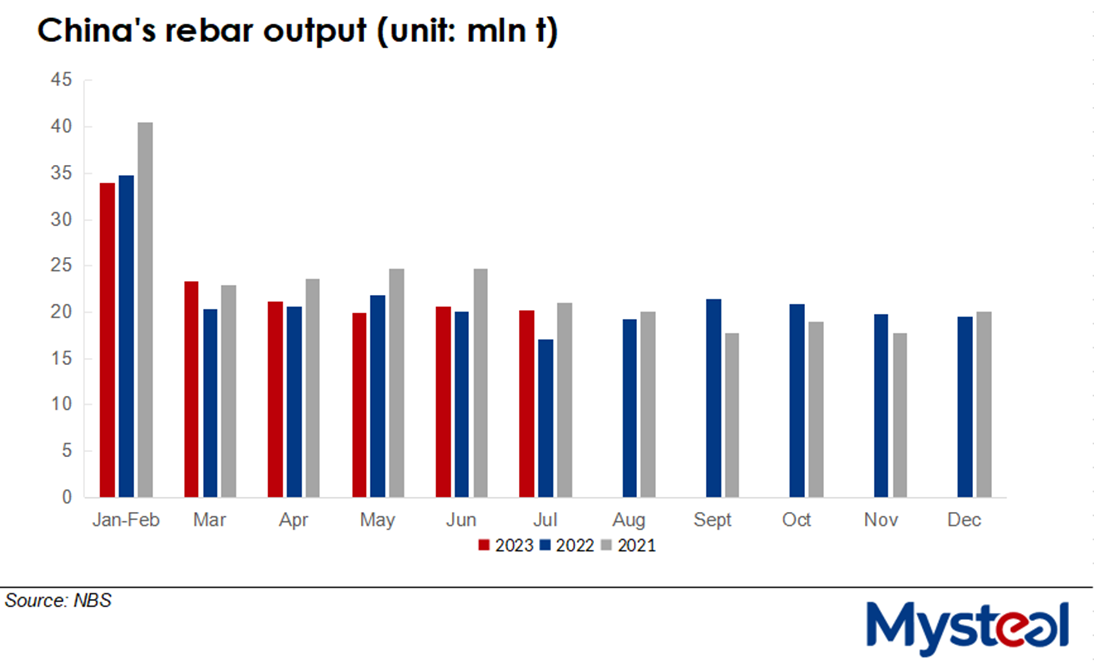 For July alone, China produced 20.2 million tonnes of rebar, jumping by 18.8% on year, mainly due to the low base in the same period last year, the NBS data showed.