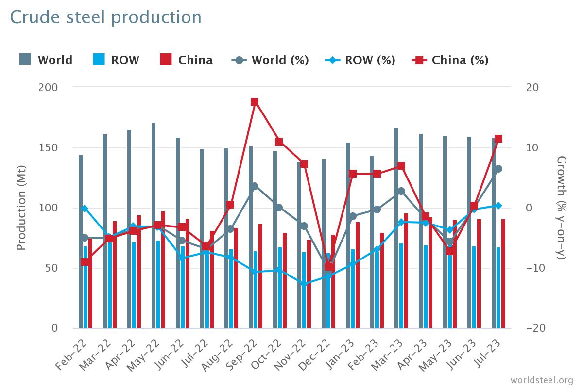 World crude steel production for the 63 countries reporting to the World Steel Association (worldsteel) was 158.5 million tonnes (Mt) in July 2023, a 6.6% increase compared to July 2022.