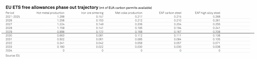 EU steel processes will see the quantity of allocated free emissions allowances reduce in a non-linear trajectory from existing levels to zero by 2034. This will lead to heavier emissions costs for producers forced to buy EU Allowance, or EUA, carbon permits for compliance. The ETS free allowances are to be replaced by the CBAM from 2026 and 2034.