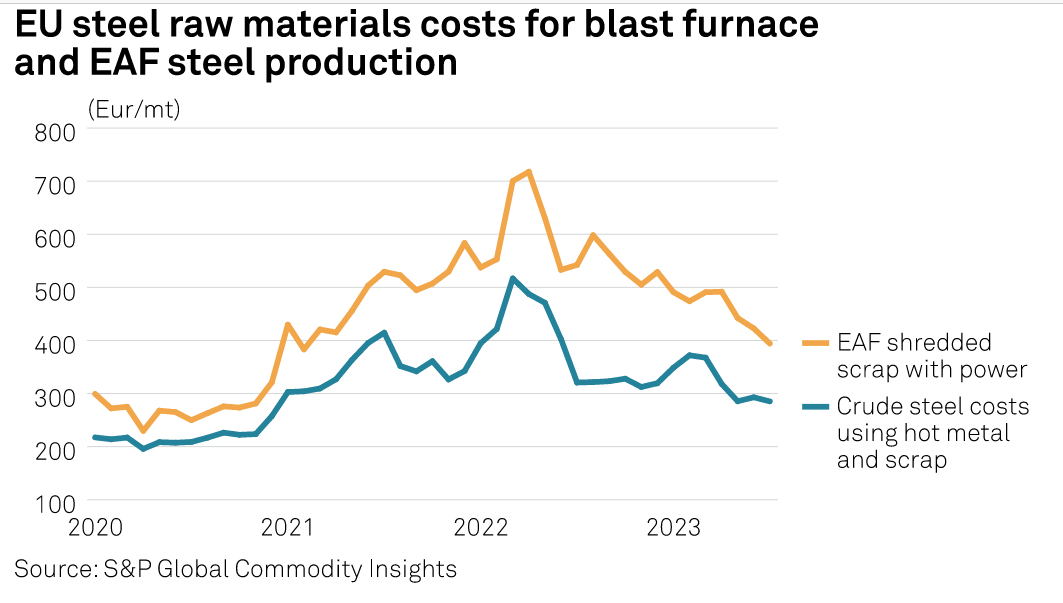 The removal of free EUAs would lead to additional costs for steel producers exceeding benchmark levels. Based on reference values for blast furnace-based steel mills producing met coke and iron ore sinter, higher costs of around Eur144.72/mt of finished steel can be expected, with a reference cost for electric arc furnace carbon steel producers of Eur18.93/mt of steel, using July average EU carbon prices and analysis by S&P Global Commodity Insights.