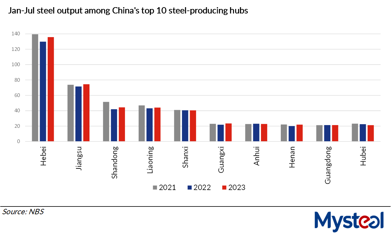 Six out of the top 10 steelmaking provinces and autonomous regions across China posted on-year increases in their crude steel production over January-July, according to the latest data released by the country's National Bureau of Statistics (NBS). The relatively low base in 2022 partly contributed to the on-year gains but so too did improved market fundamentals, Mysteel Global notes.