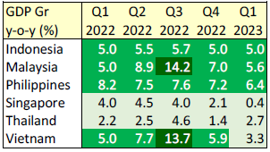 On a quarterly basis, Q1 2023 was still a growth quarter for all ASEAN-6 economies, although expansion was slower (except for Malaysia and Thailand), mainly due to rising interest rates slowing down the economies.