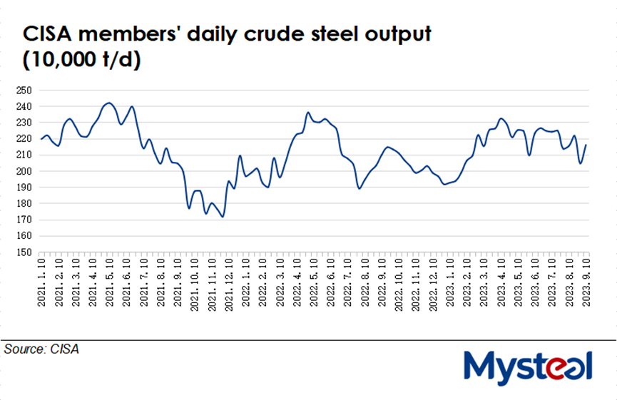 Daily crude steel output among the member mills of the China Iron and Steel Association (CISA) reversed up during the first ten days of September, rising by 5.5% or 113,200 tonnes/day from late August to reach 2.16 million t/d on average, or higher by 2.9% on year, according to the latest data released by CISA on Tuesday.
