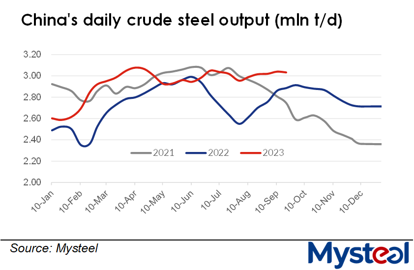 Daily average crude steel output in China retreated slightly during the middle ten days of September, with the tonnage lower by 7,200 tonnes/day or 0.2% from early September to average 3.03 million t/d, according to Mysteel's estimate based on its survey of 247 blast-furnace (BF) and 87 electric-arc-furnace (EAF) steel mills nationwide. The tiny dip nonetheless brought an end to the continuous rise begun in early August, Mysteel Global notes.
