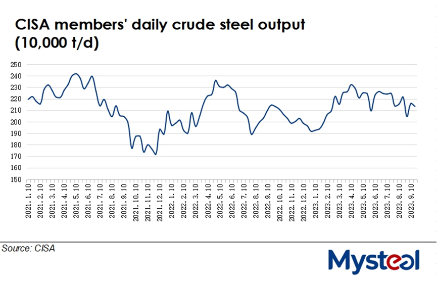 Daily crude steel output among the member mills of the China Iron and Steel Association (CISA) over September 11-20 declined from the first ten days of this month, slipping by 1.2% or 25,300 tonnes/day to reach 2.13 million t/d on average, according to the association's release late on Friday. Average daily output during mid-September was also lower by 0.5% on year, it noted.