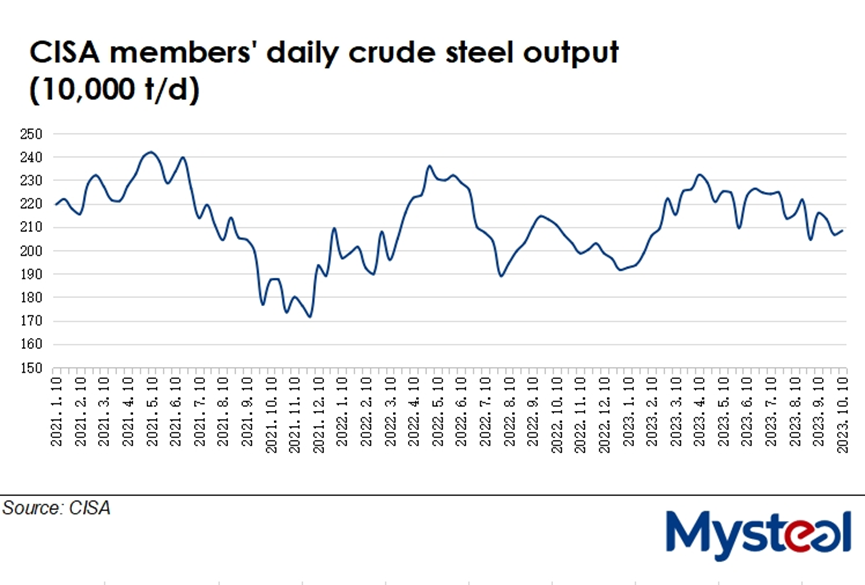 Daily crude steel output among the member mills of the China Iron and Steel Association (CISA) recovered during October 1-10 by a small 0.8% or 16,600 tonnes/day from the previous ten days to average 2.08 million t/d, according to the association's release on October 12. Market sources attributed the rise in daily output to some of CISA's member mills resuming production after finishing maintenance stoppages.