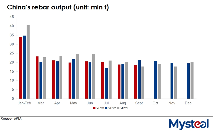 Production of rebars across China over January-September rose by a tiny 0.3% on year to 174.6 million tonnes, according to the latest data released by the country's National Bureau of Statistics (NBS) on Thursday. In contrast, output in September fell by a fairly substantial 11.4% on year to reach 18.6 million tonnes.