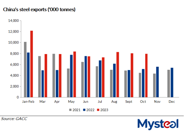 The shipments of Chinese steel products abroad in October were mainly fulfilling orders signed about two months earlier, Mysteel Global notes.