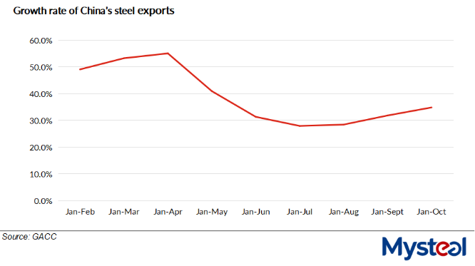 The growth rate in export volumes during the first ten-months marked the third straight rebound since the 27.9% increase recorded during this year's first seven months, Mysteel Global observed.