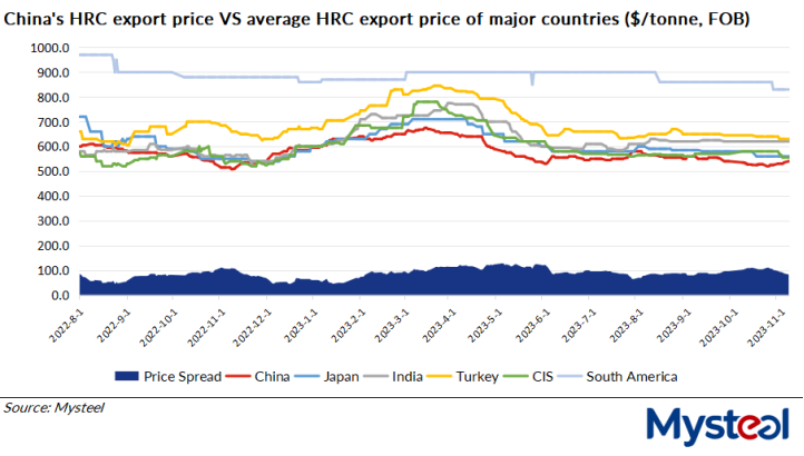 For example, as of August 31, the export price of Chinese SS400 4.75mm hot-rolled coil (HRC) was assessed by Mysteel at $550/t FOB from North China's Tianjin port, lower by $35/t compared with Japan-origin offers posted the same day, according to Mysteel's survey.