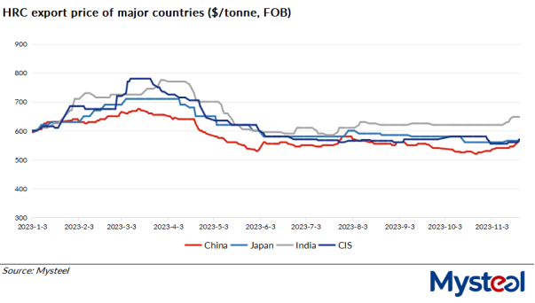 In parallel, Chinese steel products generally enjoyed price advantages in international steel markets, supporting both the activity and volume of China's steel exports. As of October 31, the export price of Chinese SS400 4.75mm hot-rolled coil (HRC) was assessed by Mysteel at $530/t FOB from North China's Tianjin port, lower by $30/t compared with Japan-origin offers posted the same day, according to Mysteel's survey.