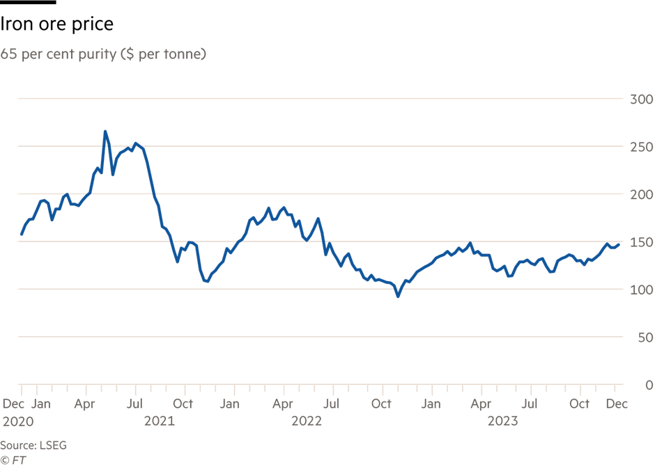 It is possible some domestic steel output is being under-reported too. China’s steel exports rose 45 per cent in 2023, mostly going to south-east Asia and Europe. This increase could explain the boost to iron ore demand. A stronger renminbi in the later months of the year also made iron cheaper to buy — just when inventories at Chinese ports were low.
