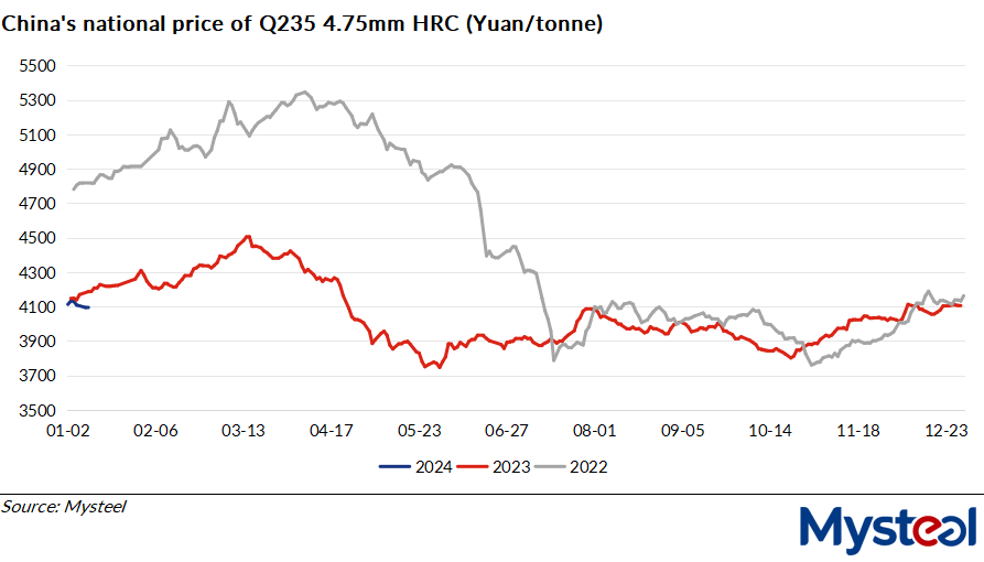 The mismatch between HRC supply and demand could see the average price of hot coils in China fall below that of 2023, Mysteel's report concludes, explaining that the price trend might rise first and then fall this year, as the country's steel market may find some support in H1 from government stimulus policies.