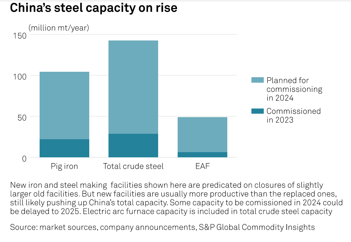 Chinese steel markets in 2024 may continue to remain under pressure due to capacity expansion, as steelmakers plan to bring 82.2 million mt/year of pig iron capacity and 114 million mt/year of crude steel capacity facilities on stream, S&P Global calculations showed.