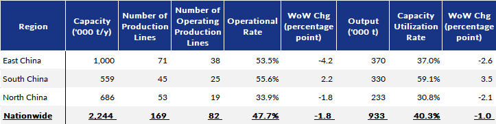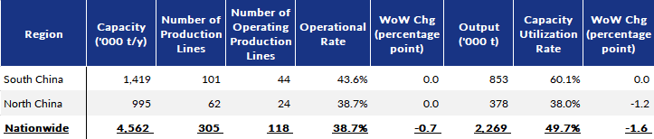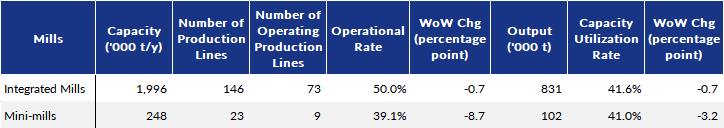 During the survey period, both the rebar rolling capacity utilization and the operational rates among these surveyed makers decreased for the fifth week in a row, with the former dipping by 1.6 percentage points on week to 49.7%, and the latter easing by 0.7 percentage point on week to 38.7%.