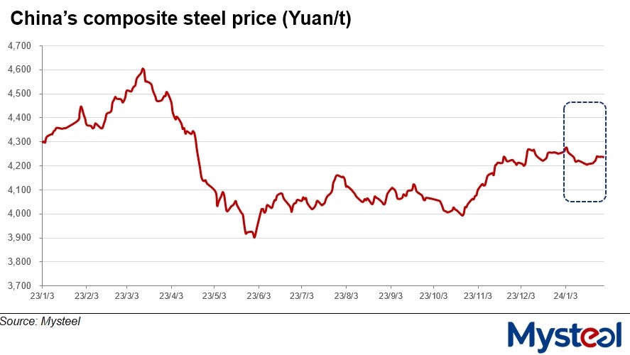 As of January 30, China's national composite steel price was assessed by Mysteel at Yuan 4,235.7/tonne ($590/t), falling by Yuan 16.2/t on month.