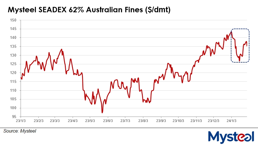 Mysteel SEADEX 62% Australian Fines for iron ore prices, for example, came in at a high level of $135.15/dmt CFR Qingdao on January 30, or rising by $5.7/dmt from a year earlier.