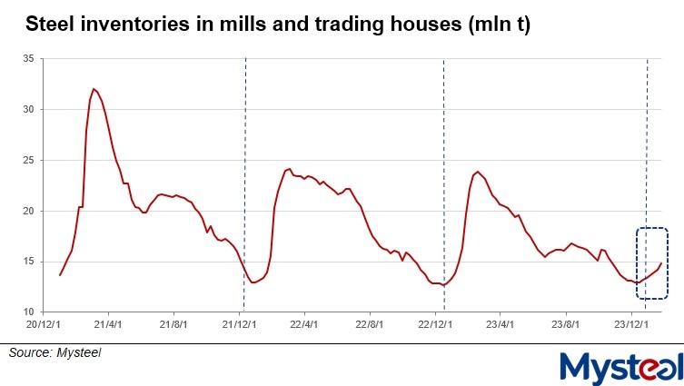 Mysteel's tracking data showed as of January 25, inventories of the five major carbon steel products – rebar, wire rod, hot-rolled coil, cold-rolled coil, and medium plate - held by the 184 steelmakers nationwide and at the trading houses in 35 Chinese cities added up to 14.8 million tonnes, higher by a large 1.5 million tonnes on month and registering the sixth monthly rise in a row.