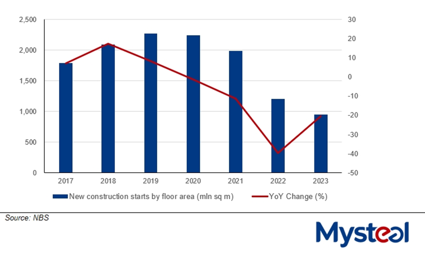 China's property sector is grappling with tight financial liquidity, and the woes now have a chilling effect on new project investment and drag the national economic growth in the big picture, according to Mysteel's report. The ongoing fund crunch within this struggling sector will exert sustained pressure on domestic steel demand, particularly for long steel items, throughout 2024, the report predicts.