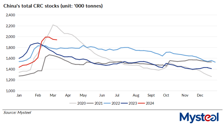 As of March 15, total CRC inventories at the sampled 29 mills and commercial warehouses in the 26 cities Mysteel regularly monitors had eased for three consecutive weeks to sit at 1.94 million tonnes, lower by 2.5% from its previous high in late February, Mysteel's tracking showed.