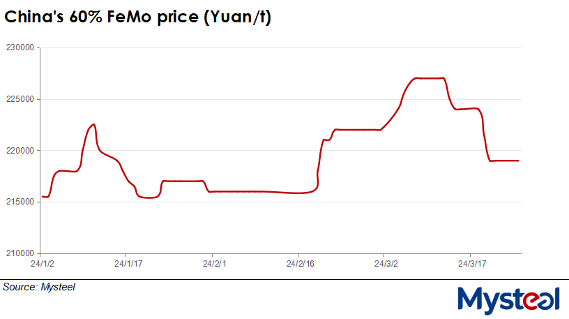 On March 22, the price of 60% FeMo in Northeast China, a major production hub in the country for the noble alloy, fell to Yuan 219,000/tonne ($30,369/t) including the 13% VAT, with an on-week drop of Yuan 5,000/t, according to Mysteel's assessment.