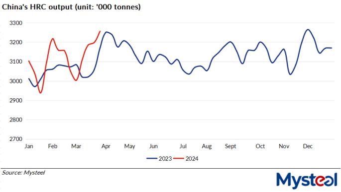 Output of hot-rolled coils (HRC) among the 37 Chinese flat steel producers Mysteel regularly monitors increased during April 1-5, gaining by another 36,100 tonnes or 1.12% on week to reach 3.26 million tonnes, Mysteel's latest weekly production survey shows. The rise represented the fifth straight weekly increase and occurred despite much of China being on holidays over April 4-6 for Qingming Festival celebrations.