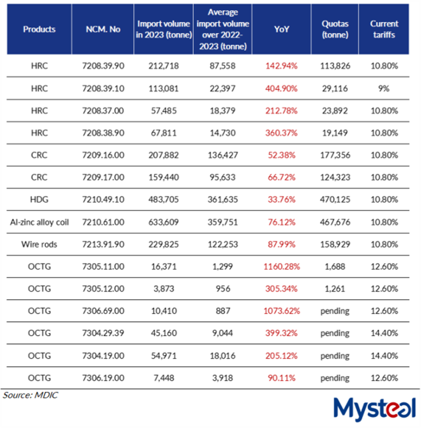 As Mysteel Global earlier reported, the country's foreign trade body on Tuesday decided to enforce import quotas on 11 steel products, alongside the imposition of a 25% tax on imports of these steel products whose volume in 2023 exceeded by 30% the average of external purchases that occurred between 2020 and 2022 to safeguard its domestic steel industry.